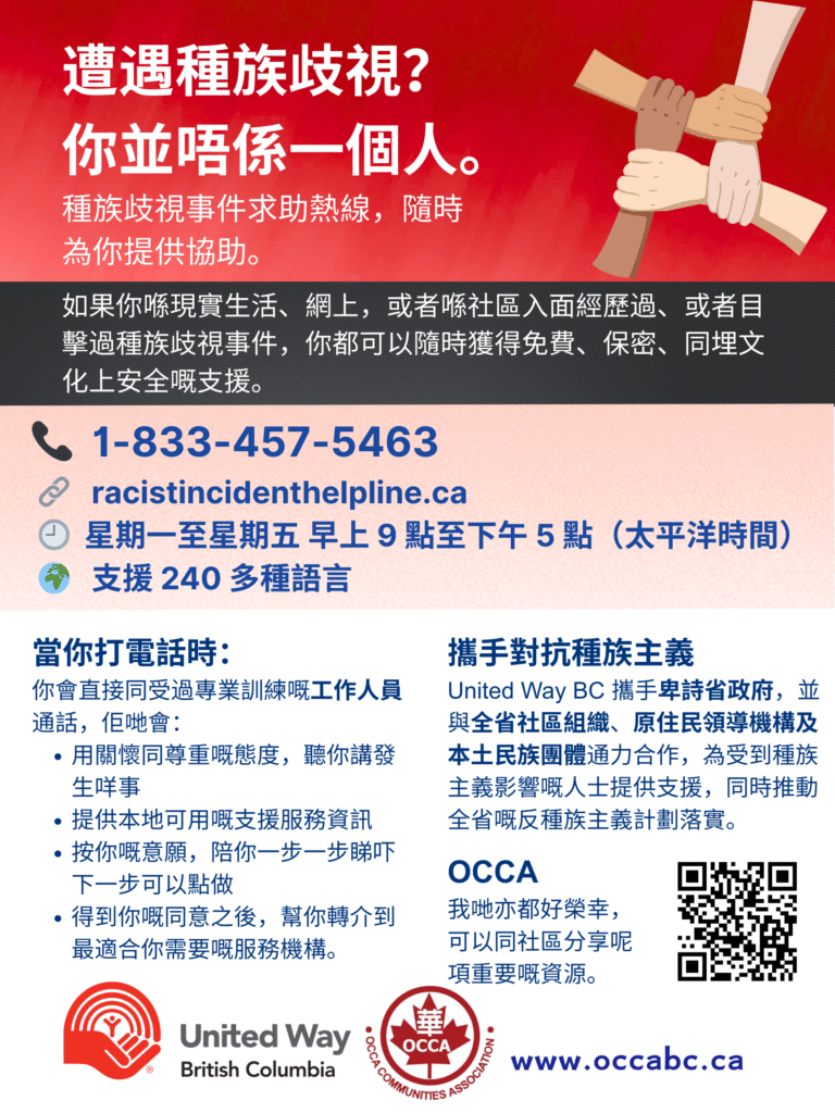 卑诗省政府与 United Way BC 共同推出了种族歧视事件热线(Helpline,提供保密,多语言的支持服务。我们社区也正在积极宣传这一重要资源,希望让更多人在需要时可以获得支持。