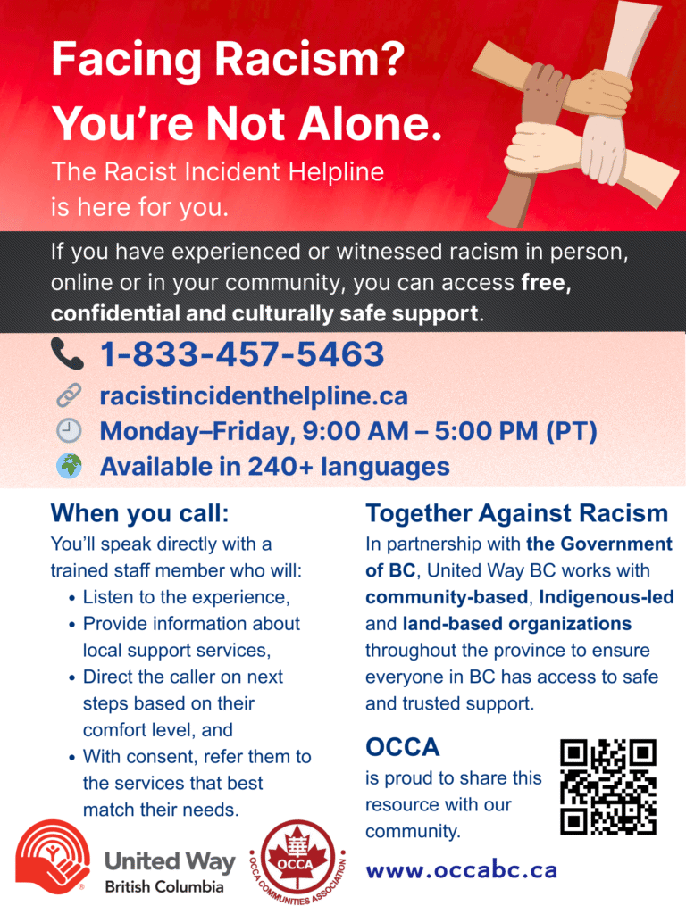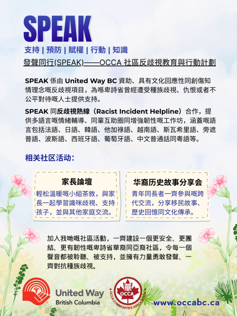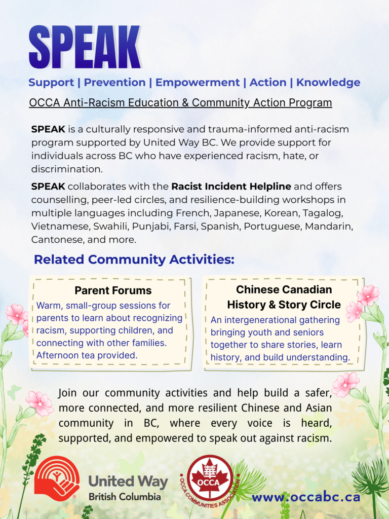 At the same time, we warmly invite you to learn about and participate in OCCA’s SPEAK (Support, Prevention, Empowerment, Action, Knowledge) program. This culturally responsive and trauma-informed anti-racism support initiative is designed for Chinese and Asian communities across BC. SPEAK offers safe spaces, healing discussions, and empowerment workshops (including parent forums and sharing sessions on Chinese-Canadian history). Everyone is welcome to join.