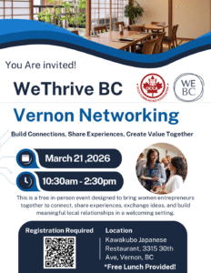 Our We Thrive BC women entrepreneur support program will be concluding with its final sessions over the next couple of weeks, and our community greatly appreciates the valuable support provided by WeBC. An in-person gathering in Vernon is scheduled for March 21, and I wonder if any member of your team would be interested in attending. There will be 24 participants, and a free lunch will be provided.