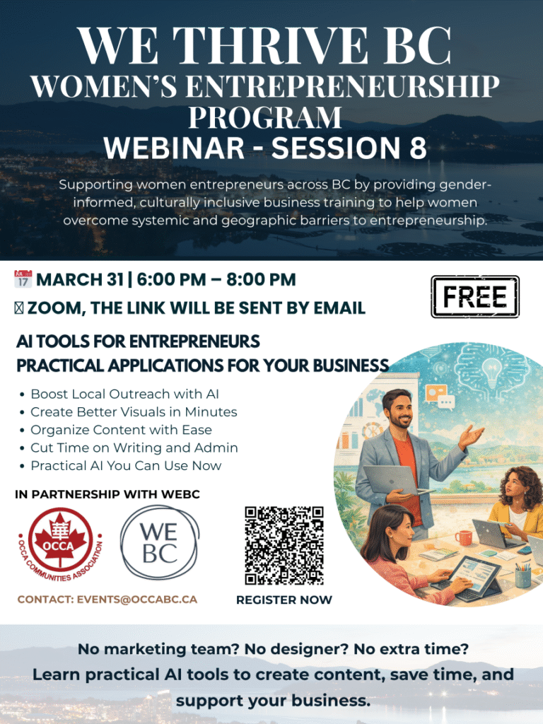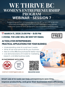 Are you ready to grow your business with confidence and clarity? Join We Thrive BC, a supportive and empowering webinar designed for self-identifying women who are starting or already running a business in BC. In this dynamic 2-hour session, you’ll gain practical tools and strategies to strengthen your brand, expand your online presence, and build a loyal community around your business.