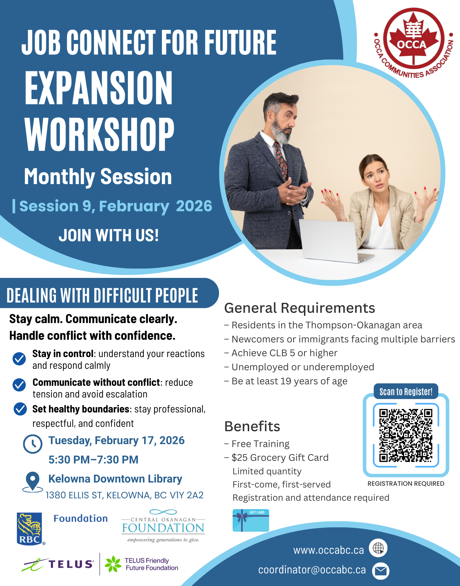This free, interactive workshop will help you stay calm, communicate clearly, and handle challenging situations with confidence — essential skills for success in Canada’s workplace.