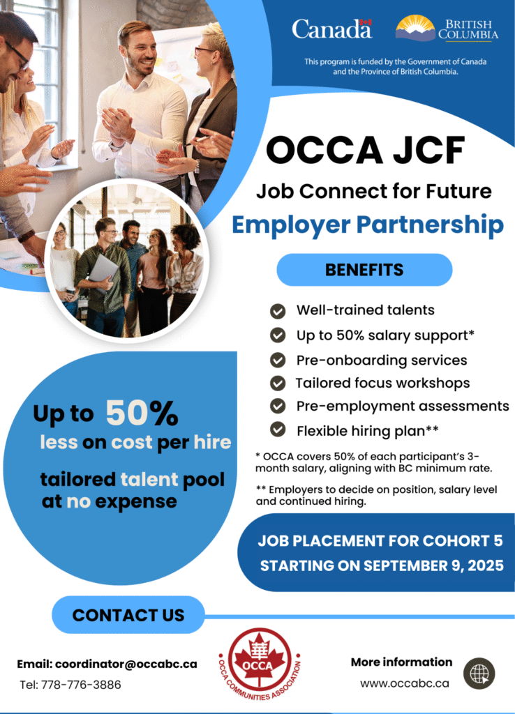 Are you a new immigrant or an immigrant facing multiple barriers on your journey to sustainable employment? The OCCA JCF program is here to support you on your path to success. This 6-month program, exclusively available in the Thompson-Okanagan region, is designed to provide tailored solutions for immigrants like you. Thanks to funding from the Ministry of Post Secondary Education and Future Skills, the Government of British Columbia, we offer a comprehensive set of services to empower you in your quest for stable employment and personal growth.