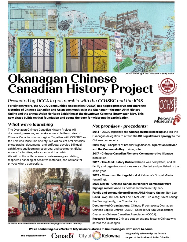 Since its founding in 2009, the OCCA Communities Association (formerly the Okanagan Chinese Canadian Association) has been at the forefront of preserving Asian and Chinese heritage in the Okanagan—curating historical exhibits, collaborating with museums, and documenting family and community stories through its Okanagan Asian History digital archive. Over the past sixteen years, OCCA has produced research, oral histories, archival collections, and public education exhibits in collaboration with: