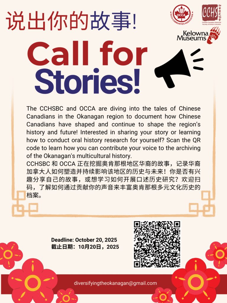 “Our partnership with CCHSBC is built on the belief that history belongs to everyone,” said Adrian Marr, Chair of the Chinese Heritage Committee of the OCCA Communities Association. “This project amplifies the voices of Chinese Canadians who helped shape the Okanagan, preserving their stories and strengthening pride in our community’s diversity.”