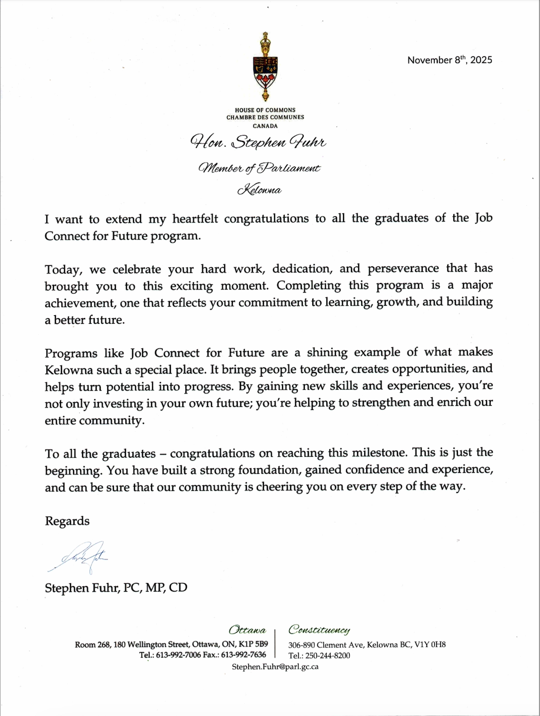 During the ceremony, Penny Pearson presented a congratulatory letter from MP Stephen Fuhr to each JCF graduate, recognizing their achievement and contribution to the community.
