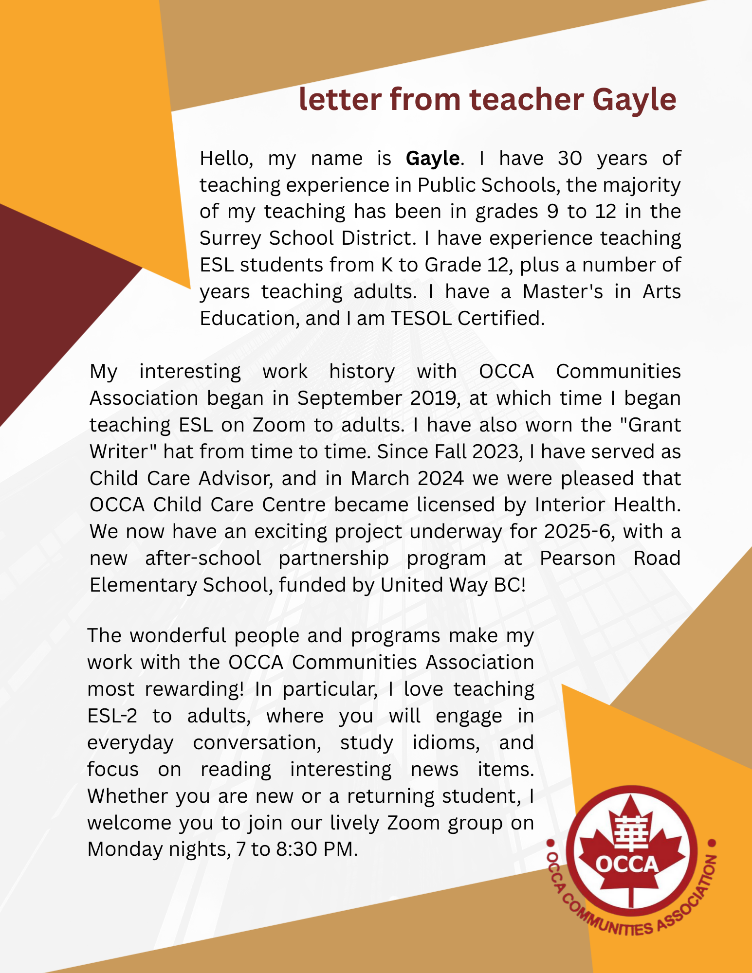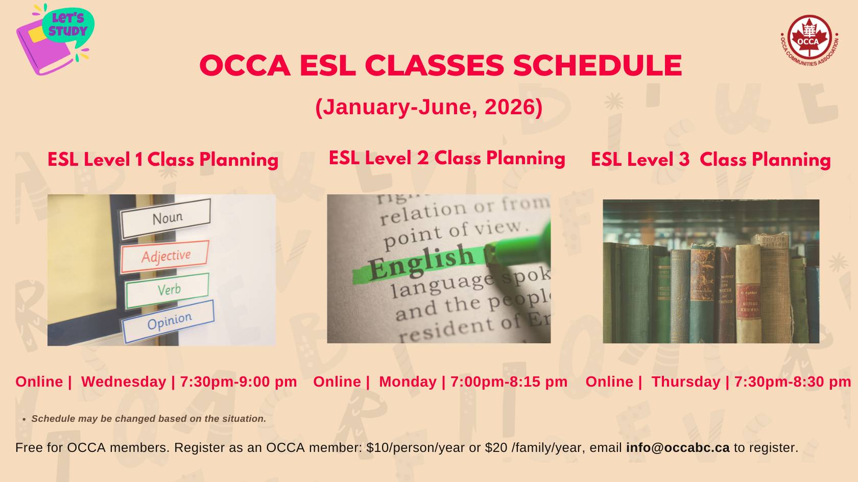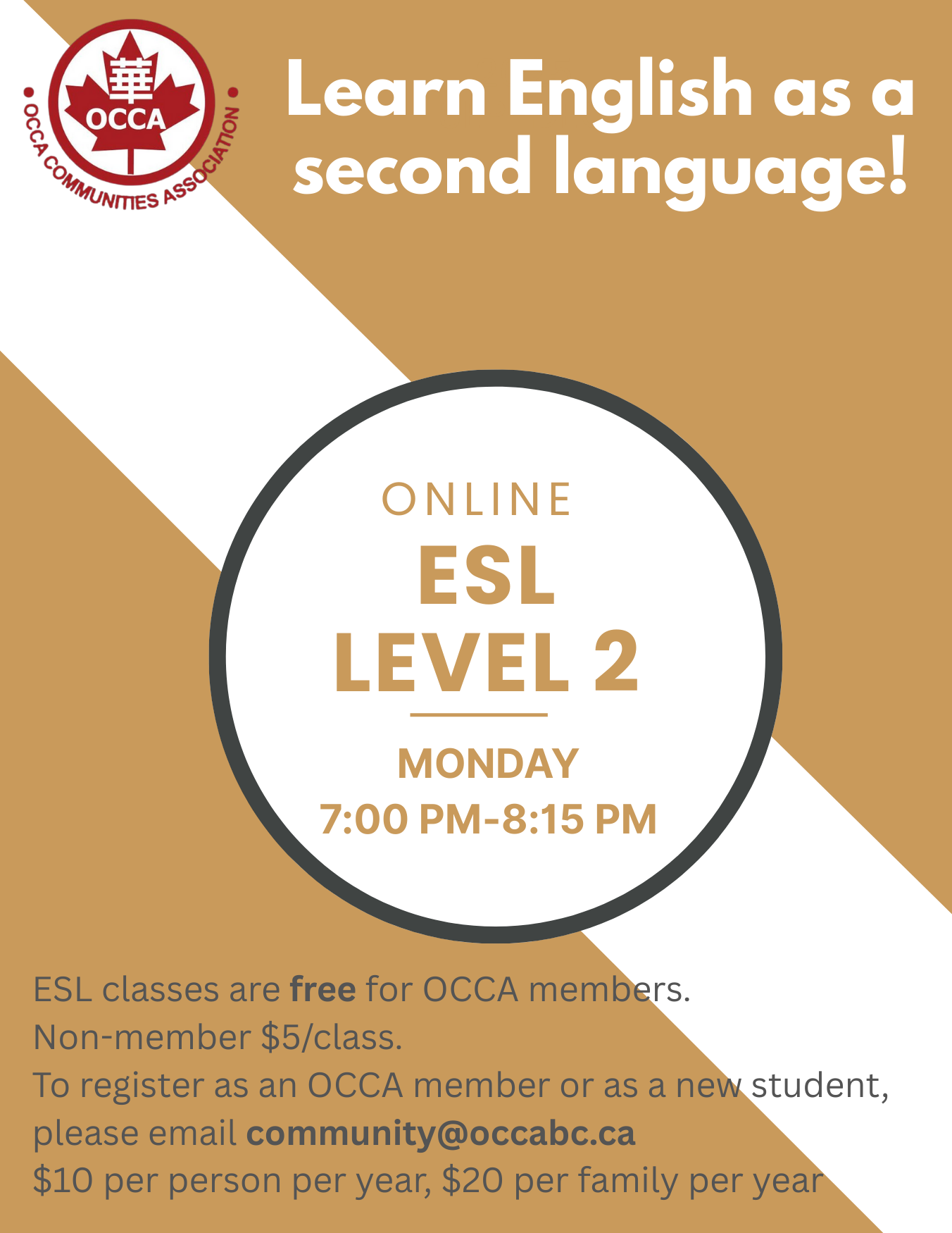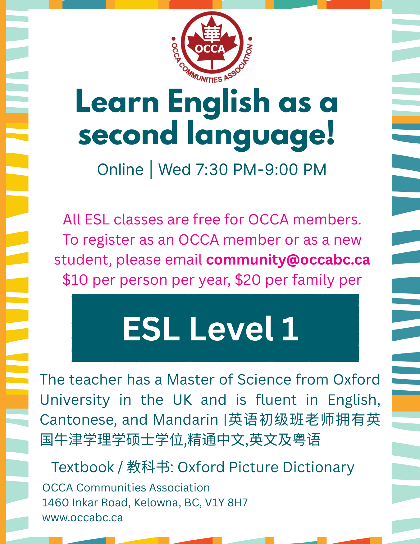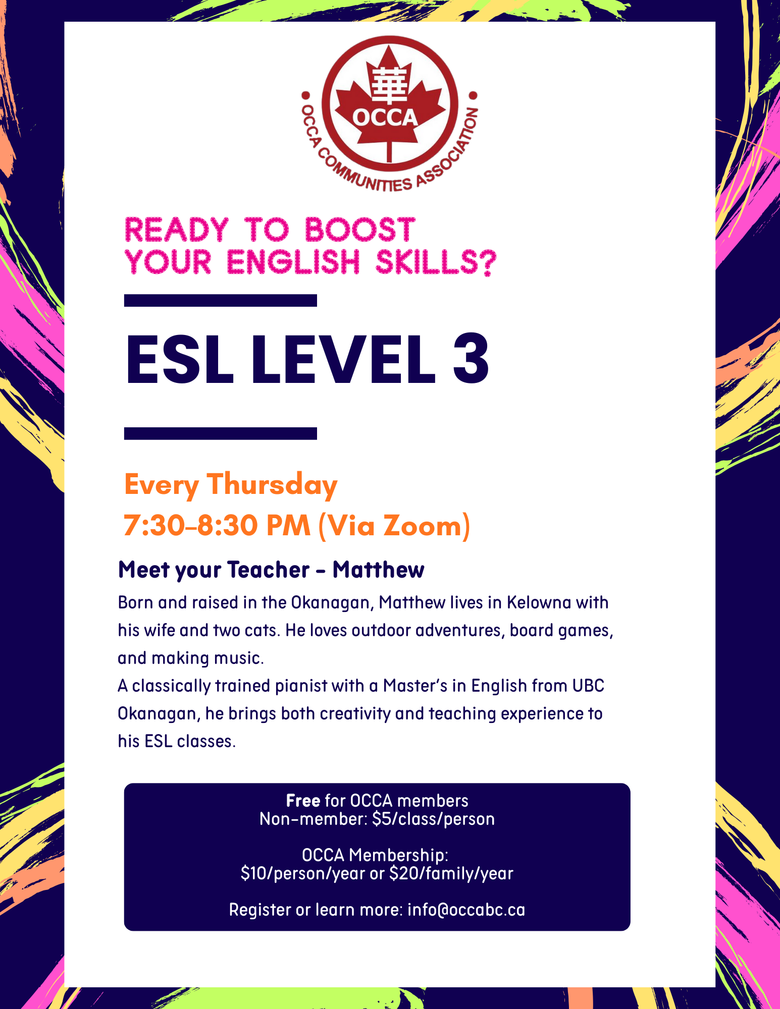 Contact OCCA at info@occabc.ca to register for membership or further information about ESL classes.